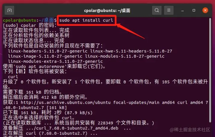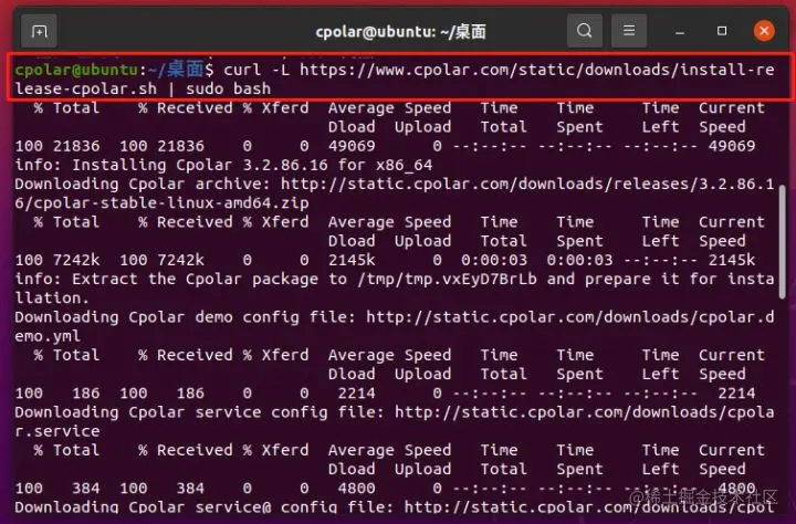 接下来,我们就能方便的安装cpolar,同样在Ubuntu的命令行窗口,在其中输入命令