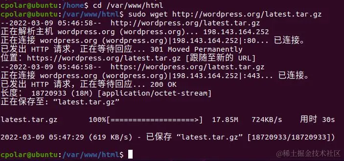 我们先输入命令“cd /var/www/html”,转入上一级目录,在该目录下输入命令,下载WordPress的压缩包