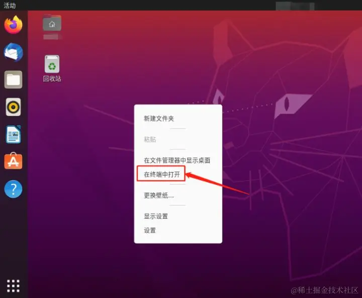 首先我们先安装网站所需的运行环境即数据库,我们可以在Ubuntu系统桌面,点击鼠标右键,并在菜单中点击“在终端中打开”,进入Ubuntu系统的命令行界面。