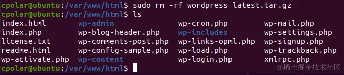 解压完成后,我们需要将WordPress的文件移动到上级目录,输入命令“sudo mv WordPress/* .”移动所有文件。从顺序上来看,之前下载的WordPress压缩包就在这一层文件夹中(可以输入“ls”查看文件夹中的文件进行确认)。为防止干扰,我们可以将WordPress的压缩包删除,输入命令sudo rm -rf WordPress latest.tar.gz”后,再输入“ls”确认压缩包已经删除