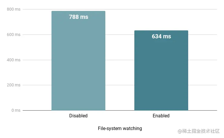 在这个例子中,我们多次运行相同的构建,在启用文件系统监视后,我们平均看到~150ms(或20%)的执行时间。