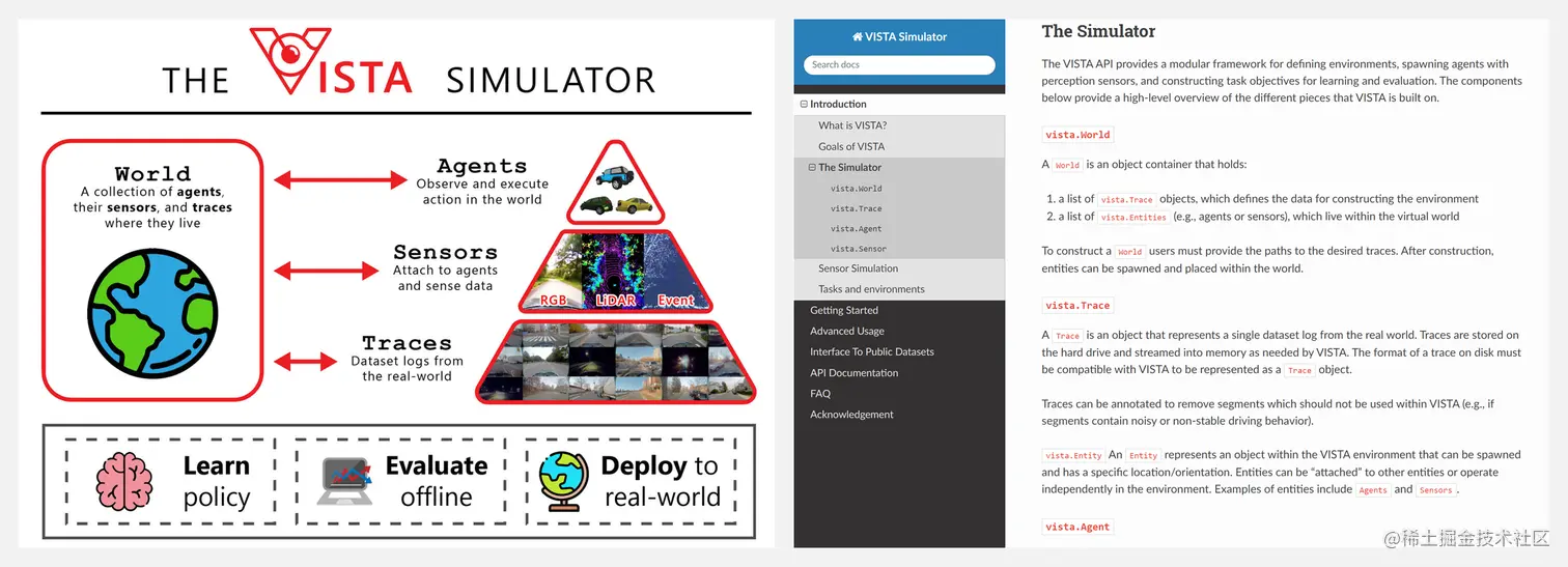 VISTA 是用于自动驾驶感知&控制的数据驱动的仿真引擎。VISTA API 提供了一个接口,将现实世界(real-world)的数据集转换为具有动态代理(dynamic agents)、传感器套件(sensor suites)和任务目标(task objectives)的虚拟环境。