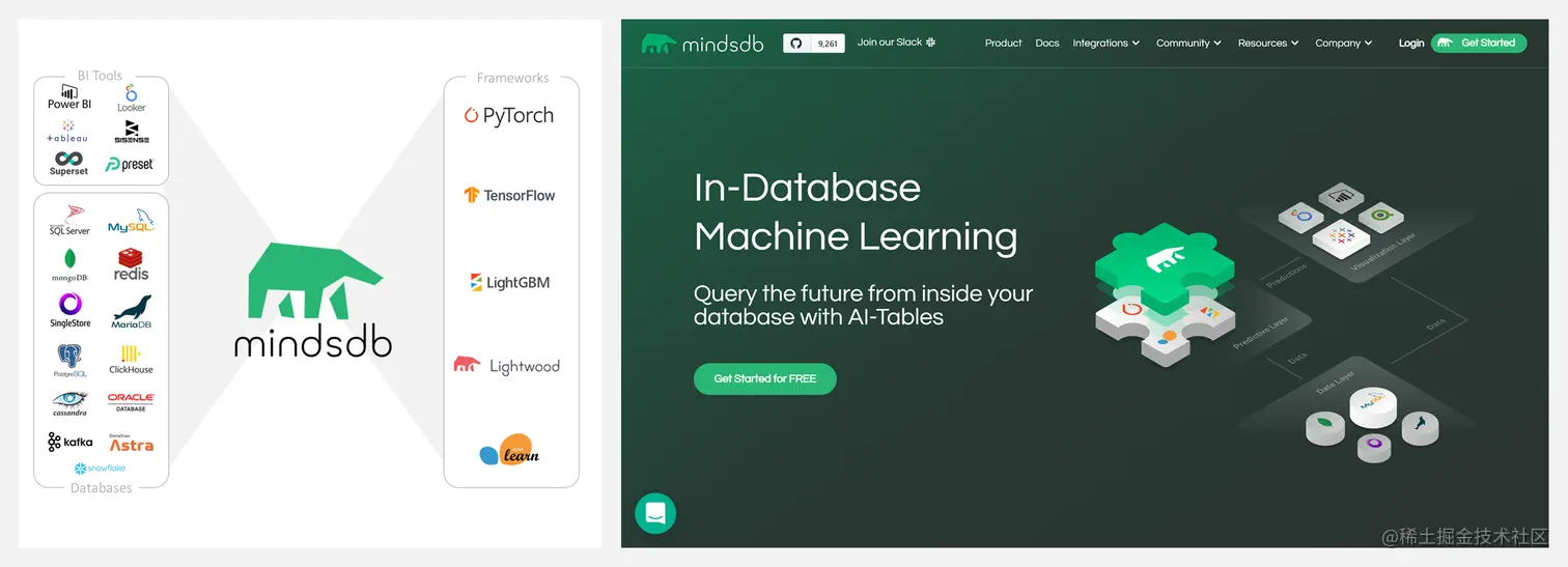 MindsDB 允许开发人员将 AI 功能快速添加到应用程序中,允许数据科学家将 ML 模型部署为 AI Table 以简化 MLOps,允许数据分析师更轻松地对复杂数据进行预测,并在 Tableau 等 BI 工具中将其可视化。