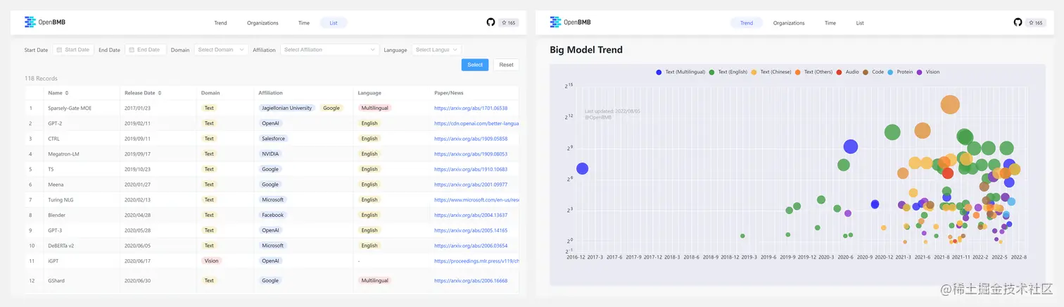 BMList 将大模型的所有信息显示在一个多维表格中,可以按照组织、语言、领域等对模型进行分类,展示了大模型的近期趋势。下图为 BM 体系架构图和网站截图。
