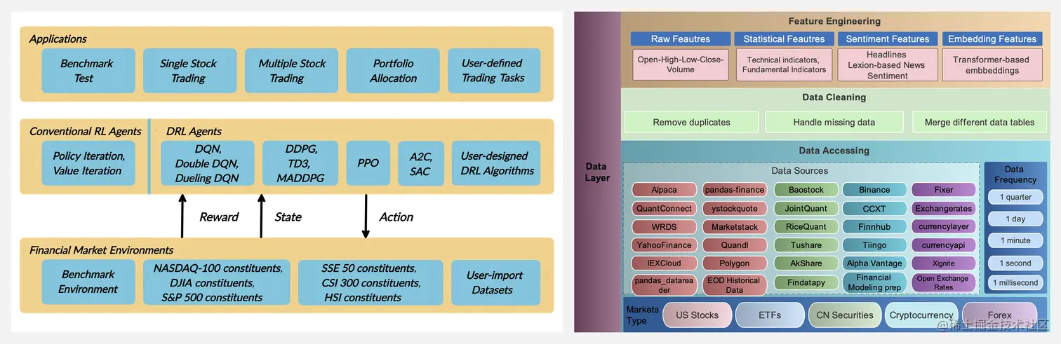 FinRL开源框架展示了金融强化学习的巨大潜力,已经发展成为一个生态系统,包括数百个金融市场、最先进的算法、金融应用程序(投资组合分配、加密货币交易、高频交易)、实时交易、云部署等。FinRL 框架具有三层:市场环境(market environments)、代理(agents)和应用程序(applications)。