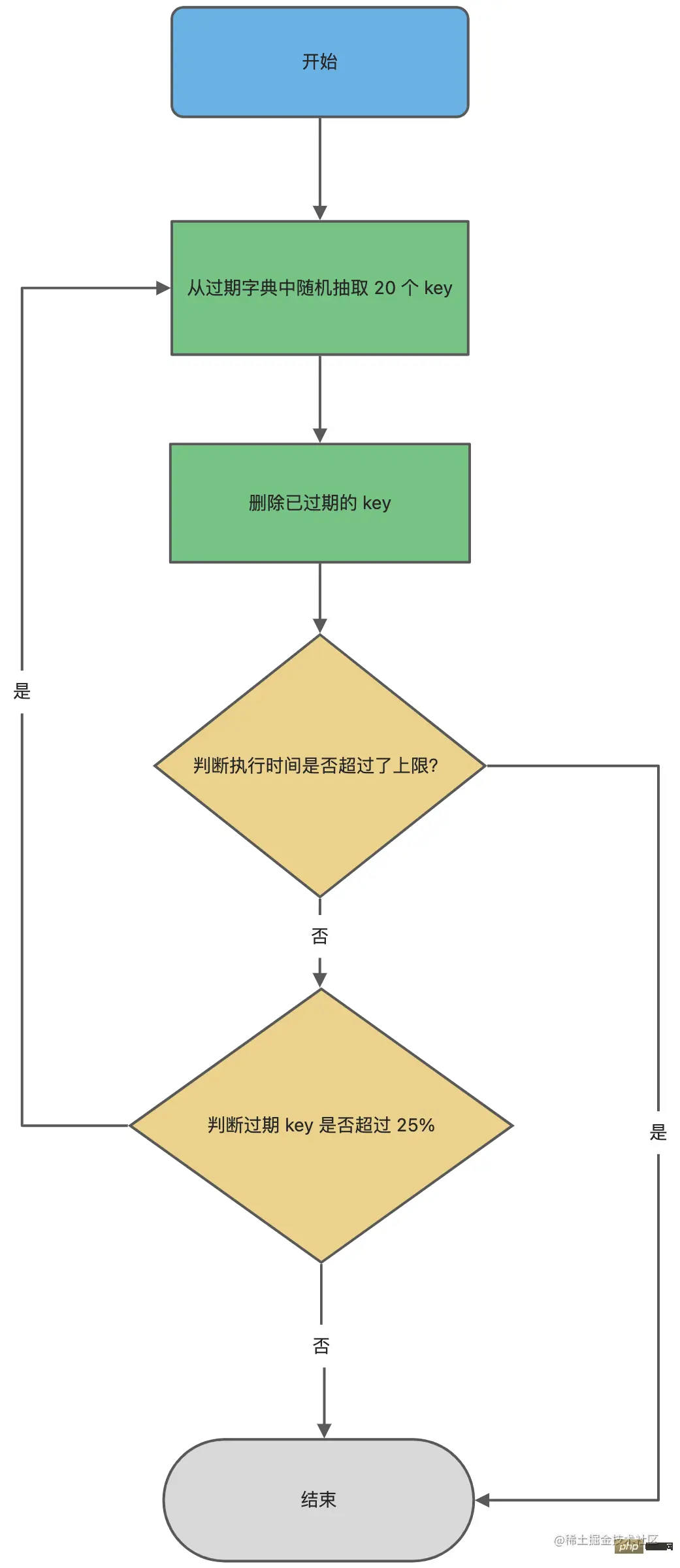 - 如果本轮检查的已过期 key 的数量,超过 5 个(20/4),也就是「已过期 key 的数量」占比「随机抽取 key 的数量」大于 25%,则继续重复步骤 1;如果已过期的 key 比例小于 25%,则停止继续删除过期 key,然后等待下一轮再检查。