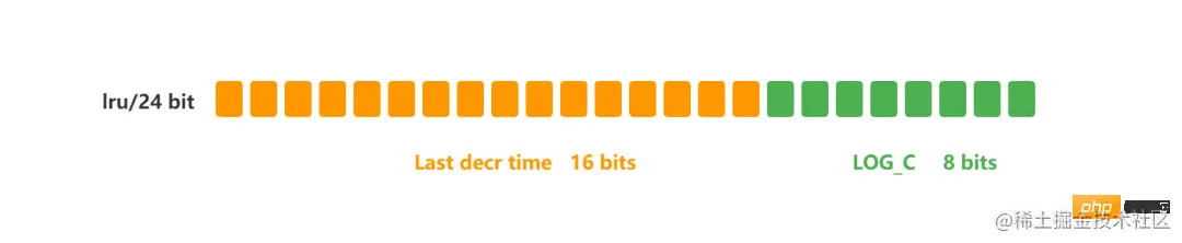 在 LFU 算法中,Redis对象头的 24 bits 的 lru 字段被分成两段来存储,高 16bit 存储 ldt(Last Decrement Time),低 8bit 存储 logc(Logistic Counter)。