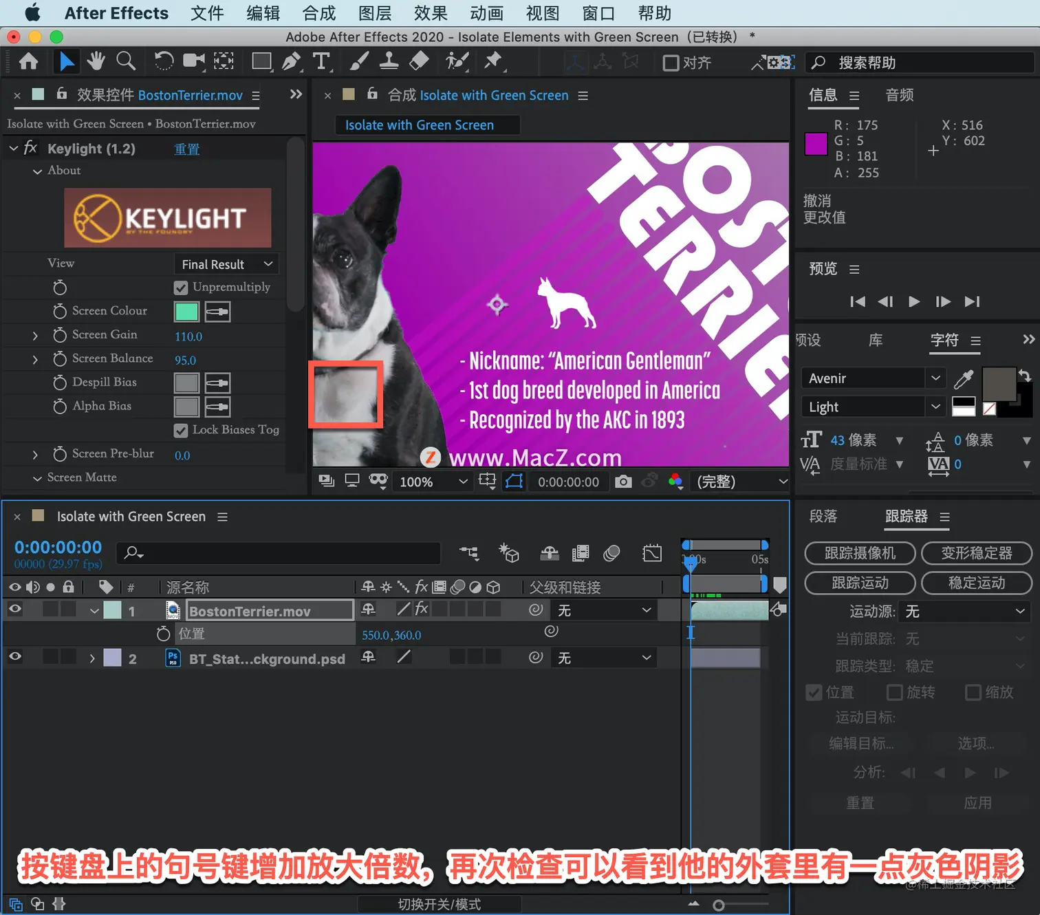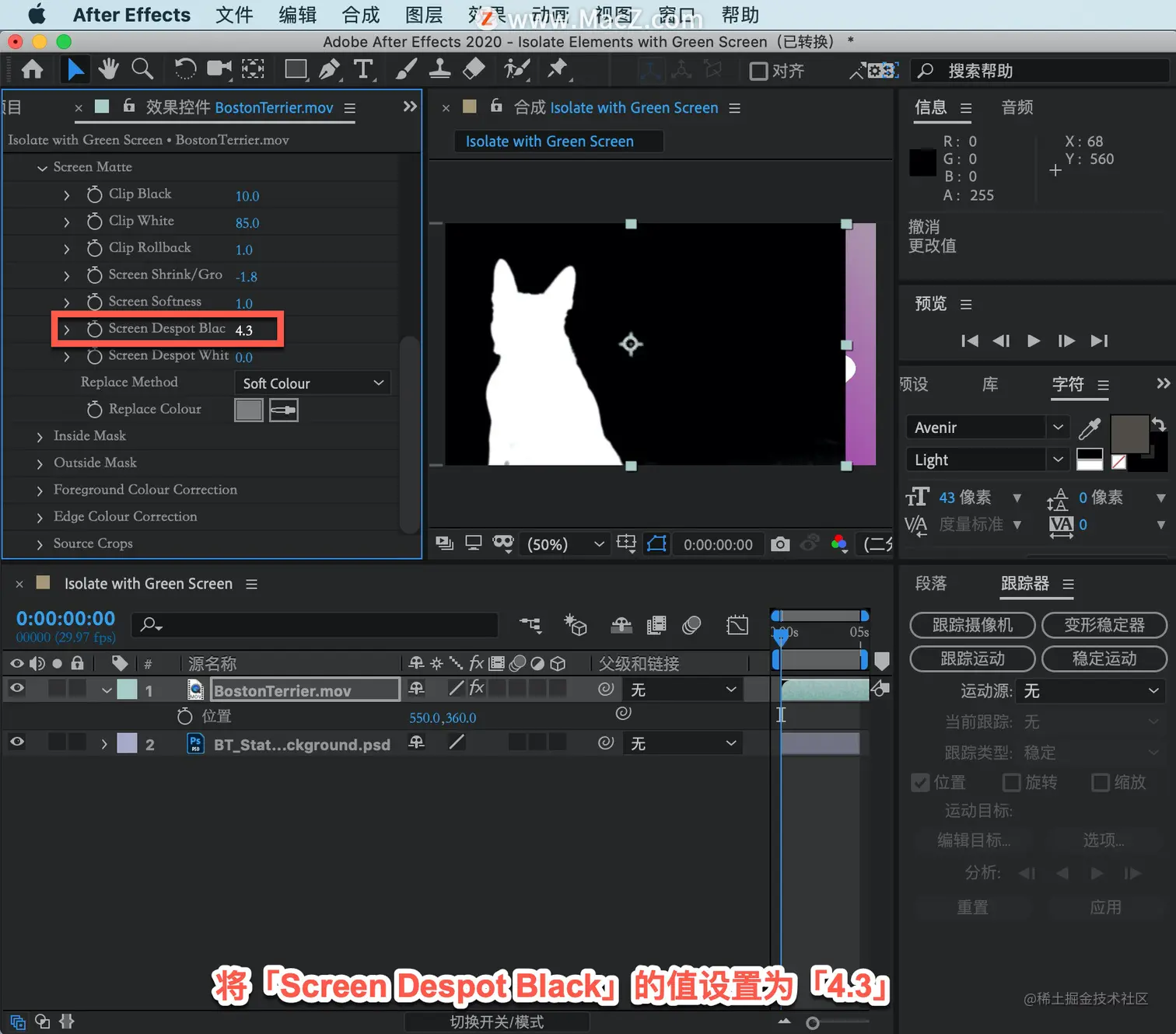 白色蒙版中有一些黑色像素,在「Keylight」中将「Screen Despot Black」的值设置为「4.3」。
