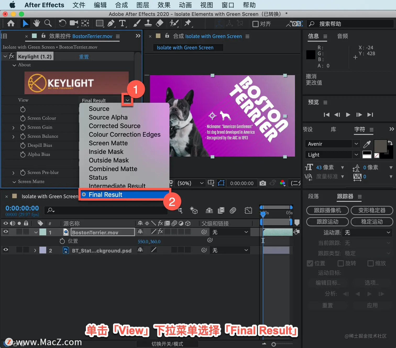 单击「View」下拉菜单选择「Final Result」,然后按空格键播放视频,仍然可以看到「图层1」里有相当多的阴影。