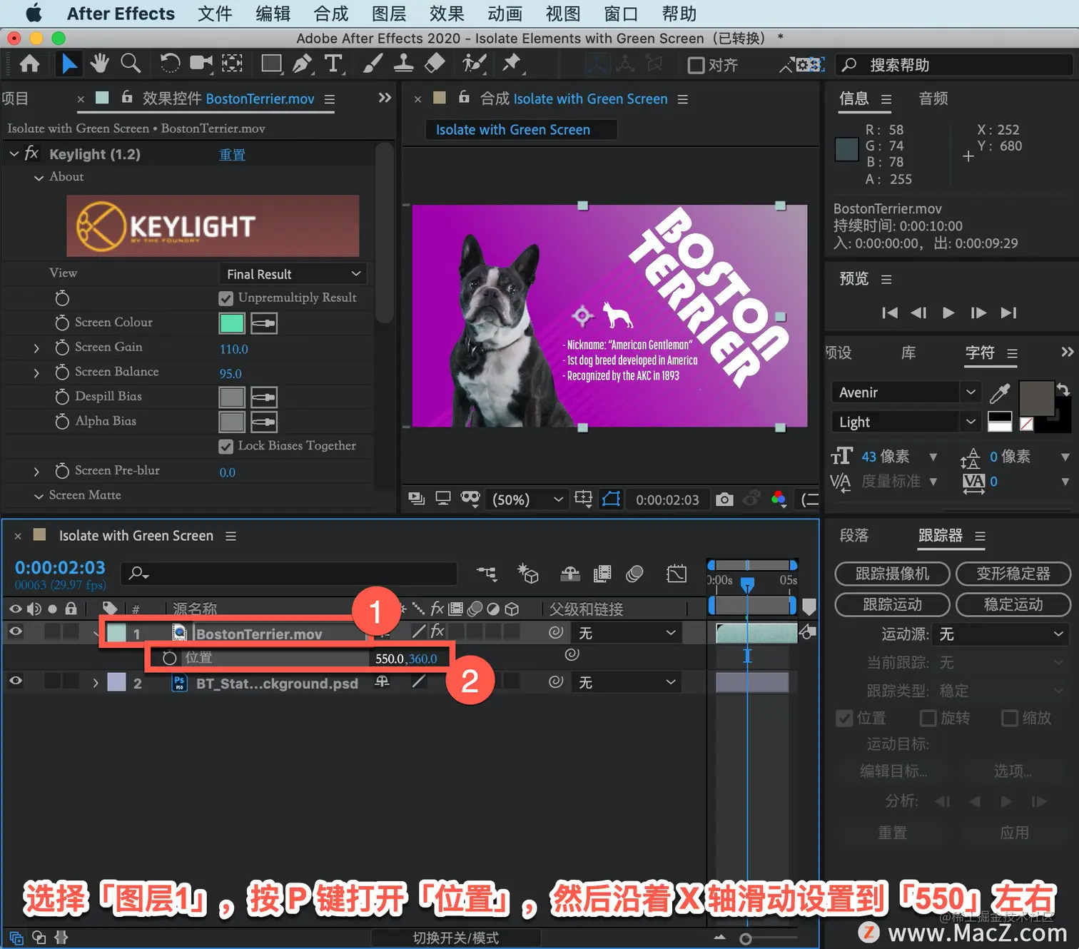 需要把他从屏幕上滑下来一点,选择「图层1」,按 P 键打开「位置」,然后沿着 X 轴滑动设置到「550」左右。
