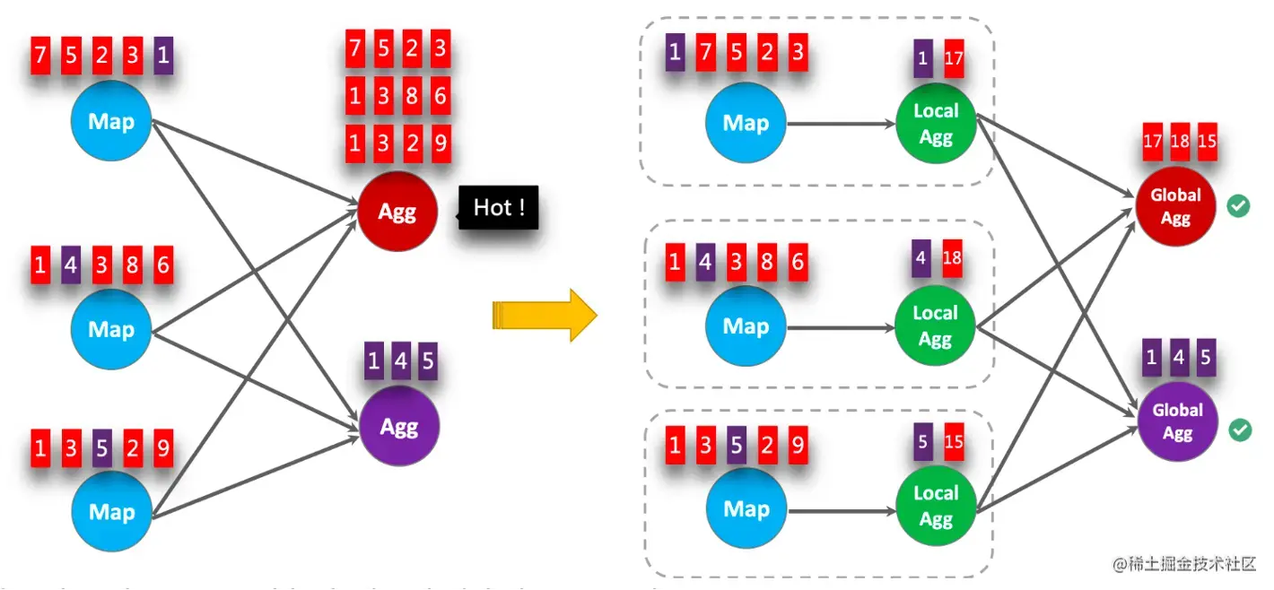 如下图所示,比如是要对数据做一个sum,同样颜色的数据表示相同的group by的key,这样我们可以再local agg阶段对他们做一个预聚合;然后到了global阶段数据倾斜就消除了。