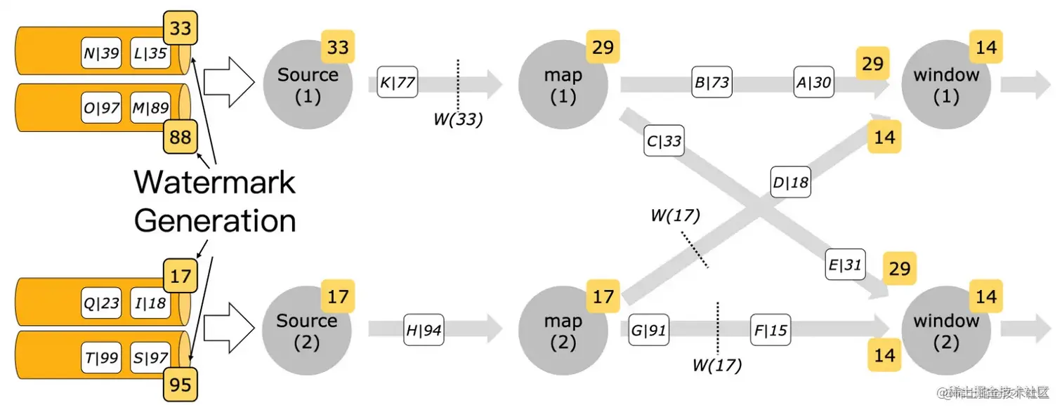 - 在Flink里早期都是per-subtask的方式进行watermark的生成,这种方式比较简单。但是如果每个source task如果有消费多个partition的情况的话,那多个partition之间的数据可能会因为消费的速度不同而最终导致数据的乱序程度增加。