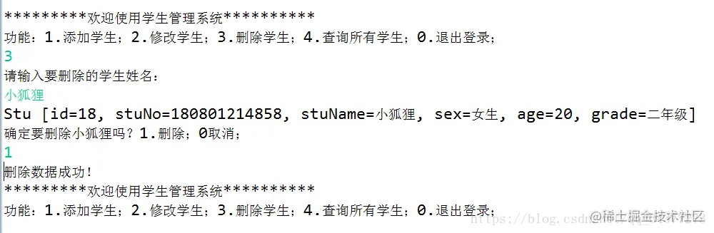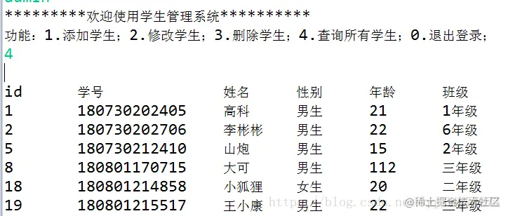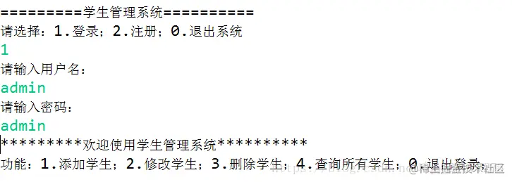 System.out.println("功能:1.添加学生;2.修改学生;3.删除学生;4.查询所有学生;0.退出登录;");