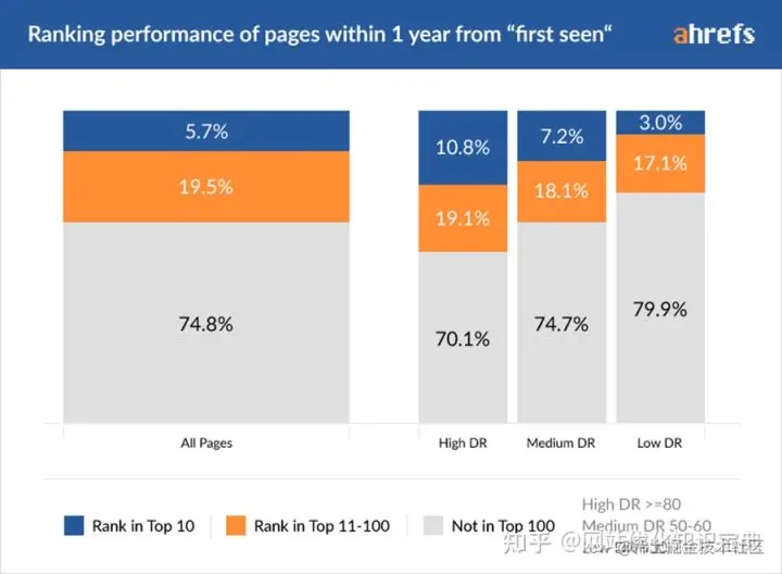 可以看到平均只有5.7%的页面能在一年内排名到前十,作为大多数普通站长,你们的DR(域名权重)都大概在30之内,这个概率更低,只有3.0%,在做排名优化软文推广的时候,如果没有排到前10,不用太在意,因为并不是那么容易,大家的情况都一样。