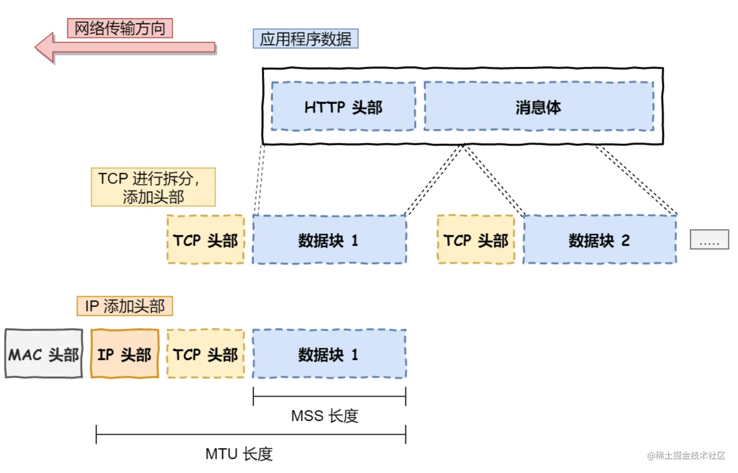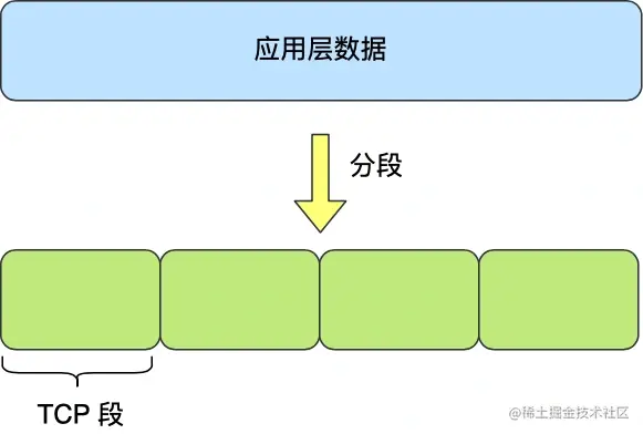 应用需要传输的数据有可能很大,如果直接传输的话不好控制(比如很大的文件如果只传一个包万一网卡就得重传,没法暂停续传),因此当传输层的数据包大小超过 MSS(TCP 最大报文段长度) ,就要将数据包分块,这样即使中途有一个分块丢失或损坏了,只需要重新发送这一个分块,而不用重新发送整个数据包。在 TCP 协议中,我们把每个分块称为一个 TCP 段(TCP Segment)。