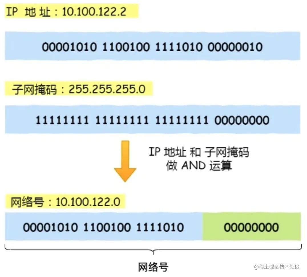 如何区分网络号和主机号?需要IP地址配合子网掩码算出网络号和主机号。其实上述中10.100.122.2 /24中的24就表示子网掩码是255.255.255.0(3个255代表的实际上就是前24个二进制位都是1,8个2进制1刚好是255),代表相同的意思。