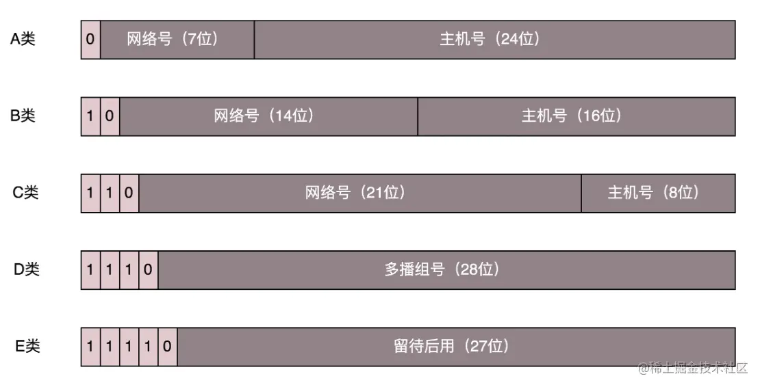 IPv4地址还被分为了5类,分别是A,B,C,D,E这五种。