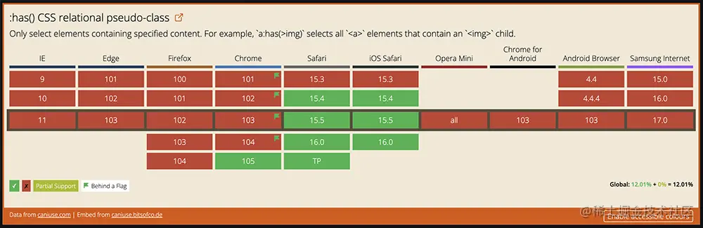 在CSS Selectors 4规范中,CSS 引入了一个名为 的新选择器:has(),它最终让我们可以选择父级。这意味着我们可以选择具有特定元素的父元素。目前Safari和Chrome105已经支持。