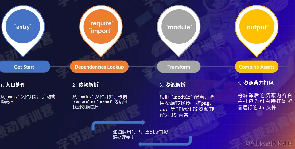 入口处理——>依赖解析——>资源解析——>资源合并打包