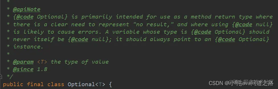 Java吸取了Scala等语言,在Java8中引入了 java.util.Optional,该类封装了Optional类型的值,可以接收泛型类型的值,可以理解为,将 所需要的对象包在 Optional对象中,变量存在时,Optional只是封装所需对象,不存在时,缺失的值会被构建成一个空的Optional对象,这个对象有Optional.empty() 方法返回