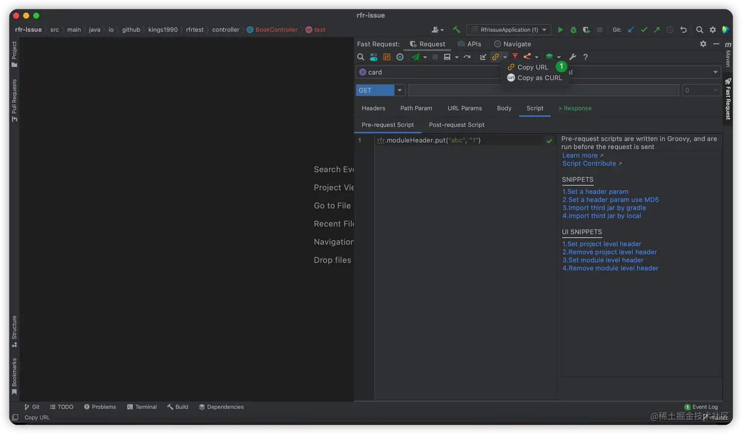 Restful Fast Request 是一个类似于Postman的IDEA插件。它是一个强大的restful api工具包插件,可以根据已有的方法帮助您快速生成url和params。 Restful Fast Request = API调试工具 + API管理工具 + API搜索工具。 它有一个漂亮的界面来完成请求、检查服务器响应、存储你的api请求和导出api请求。插件帮助你在IDEA界面内更快更高效得调试你的API。