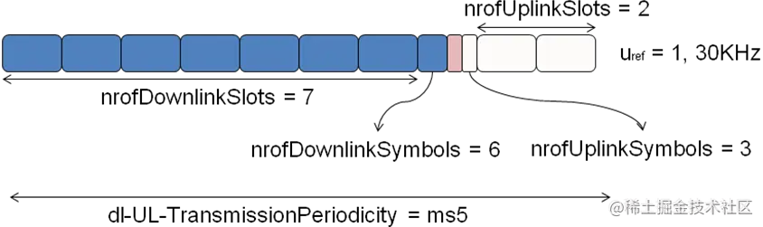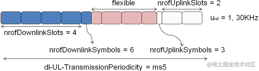 以参考子载波间隔为30KHz,周期为0.5ms,结合示例可以理解TDD-UL-DL-Pattern中的各项代表的含义。Slot中符号数减去nrofDownlinkSymbols与 nrofUplinkSymbols之和,剩余的符号称之为Flexible Symbol。