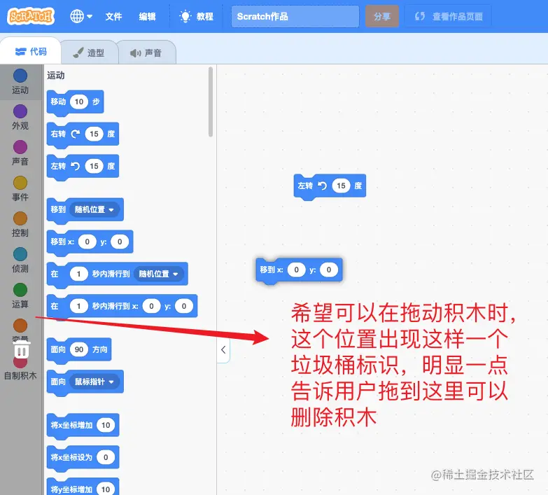 官方拖拽删除积木的标识不是很明显,如下图只有一个小手,对于年龄比较小的孩子交互提示不太友好(做大众化时还是要考虑全年龄段的用户 ( ̄▽ ̄)" )