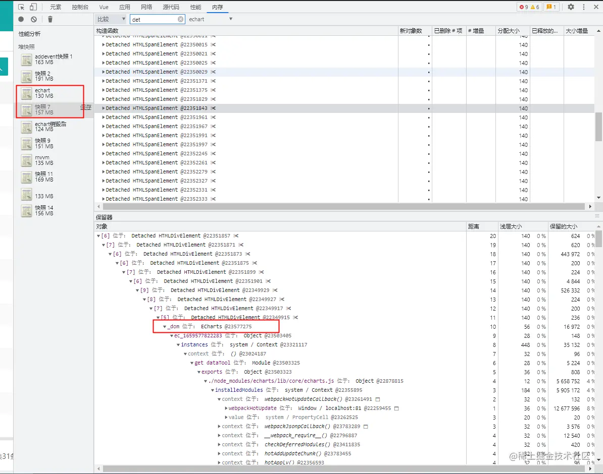 5. 在首页的内存快照里看到了echarts对象存在,所以在页面销毁时,需销毁charts对象,例: