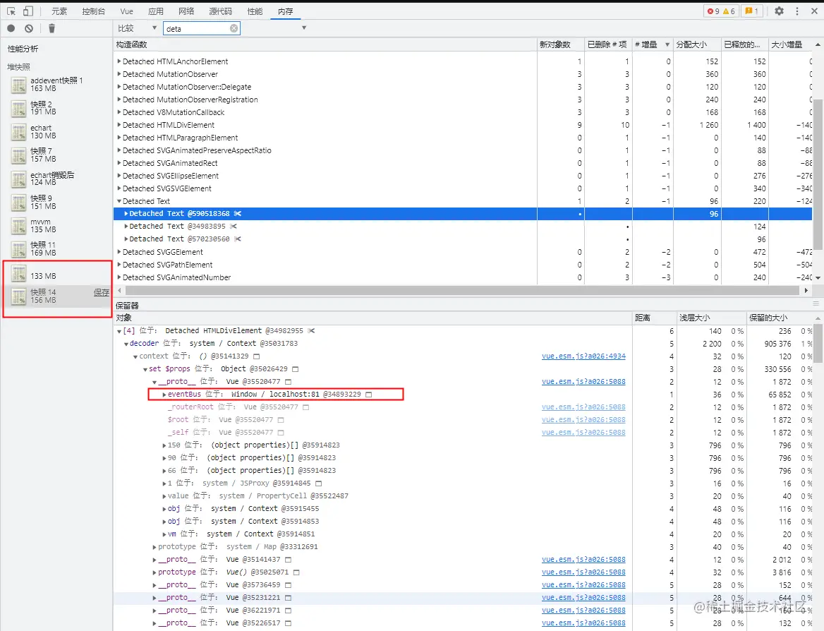 打开浏览器内存监视器看到恐怖的阶梯式增长,并且点击垃圾回收后,也不会有明显的内存下降,这个阶梯增长的现象正是的菜单的列表页面来回切换时出现的,首先大的范围就是列表页面。