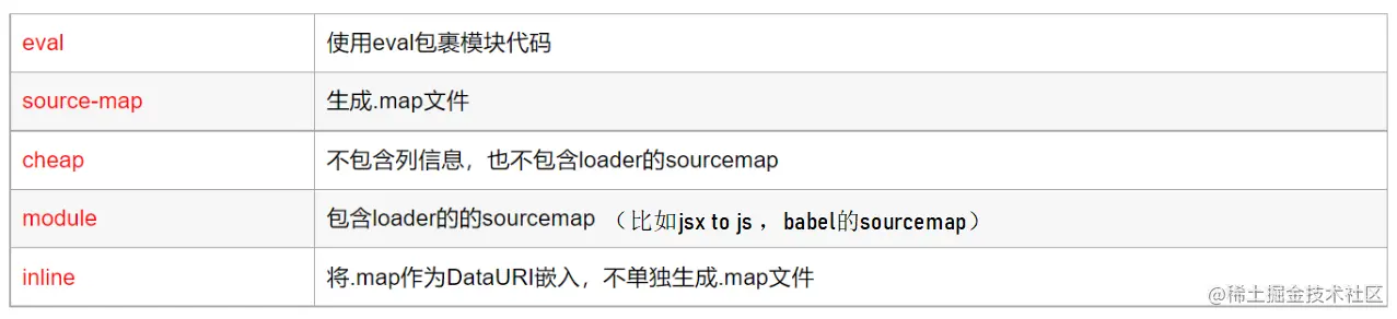 其实每个配置项都只是五个关键字eval,source-map,cheap,module,inline的任意组合,每一项都代表一个特性。