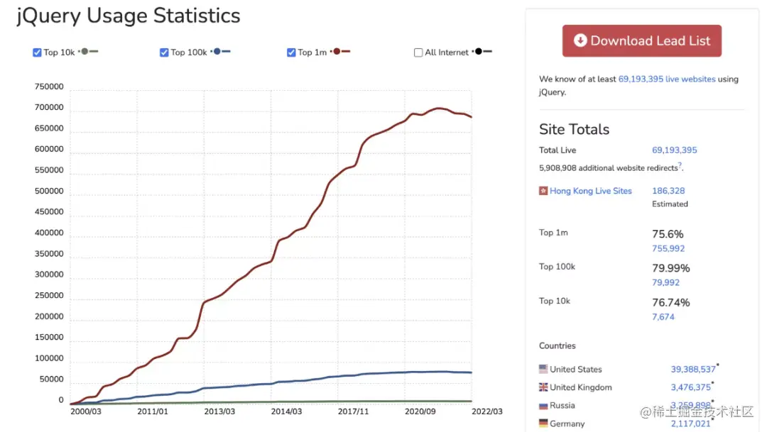 不过另一方面,根据 BuiltWith 的统计,已知正在使用 jQuery 的实时网站数量高达 69,193,395 个,流量排名前百万的网站中,使用 jQuery 的比例高达 75.6%。从使用数据来看,jQuery 江湖地位仍在,而从呼声来看,jQuery 已逐渐让位给后起之秀……