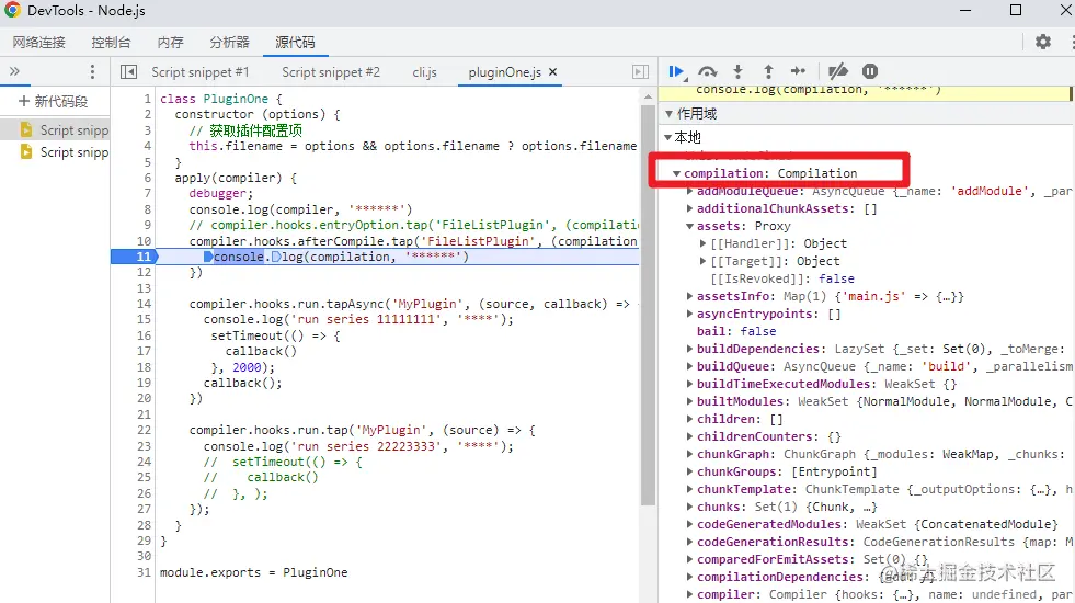 然后即可进入调试,查看compiler 和 compilation。操作其属性进行plugin的编写