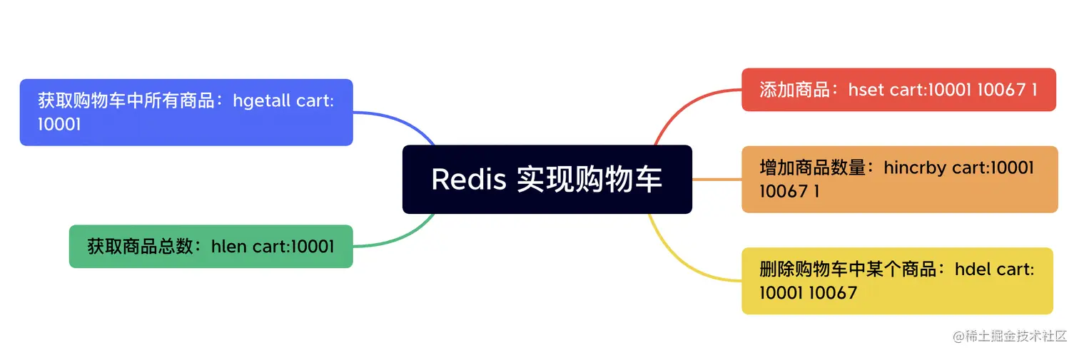 Redis 的 Hash 数据类型可以很容易实现购物车的相关操作,如下图所示。其中 cart:10001 假设是用户 id 为 10001 的用户购物车 key,10067 假设是某个商品 id。