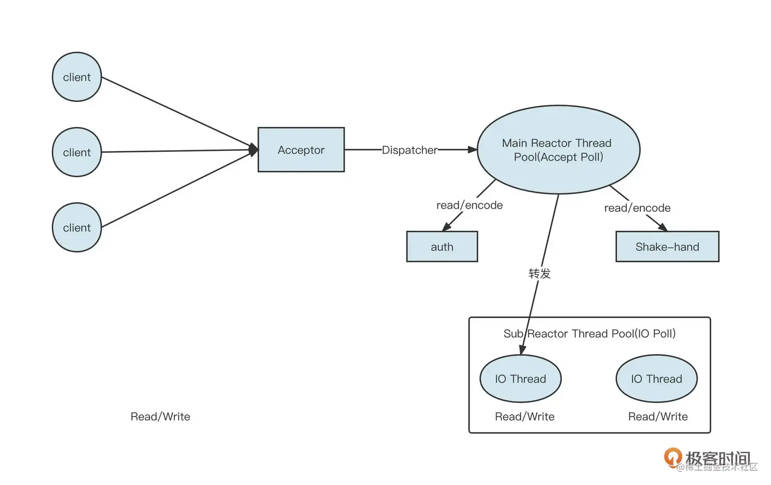 主从 Reactor 线程模型如下图所示,更详细的说明可以参见极客时间的这篇文章: 《07 | NIO:手撸一个简易的主从多Reactor线程模型》。