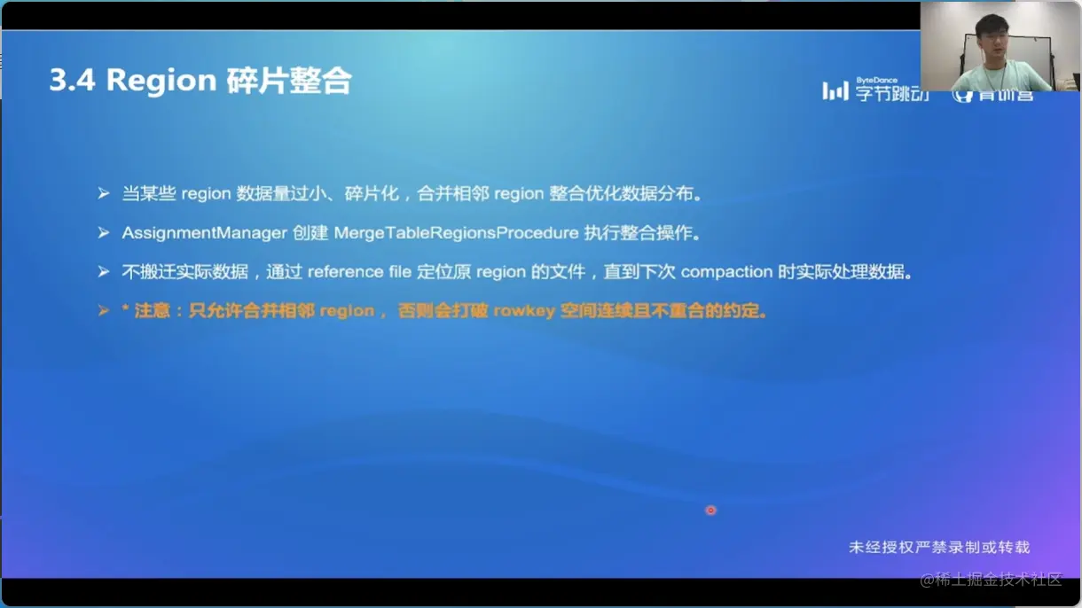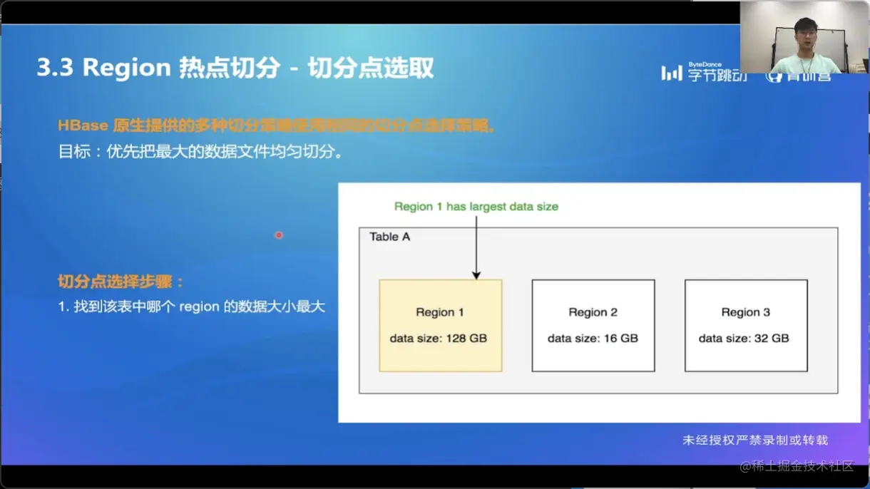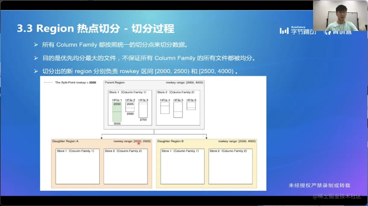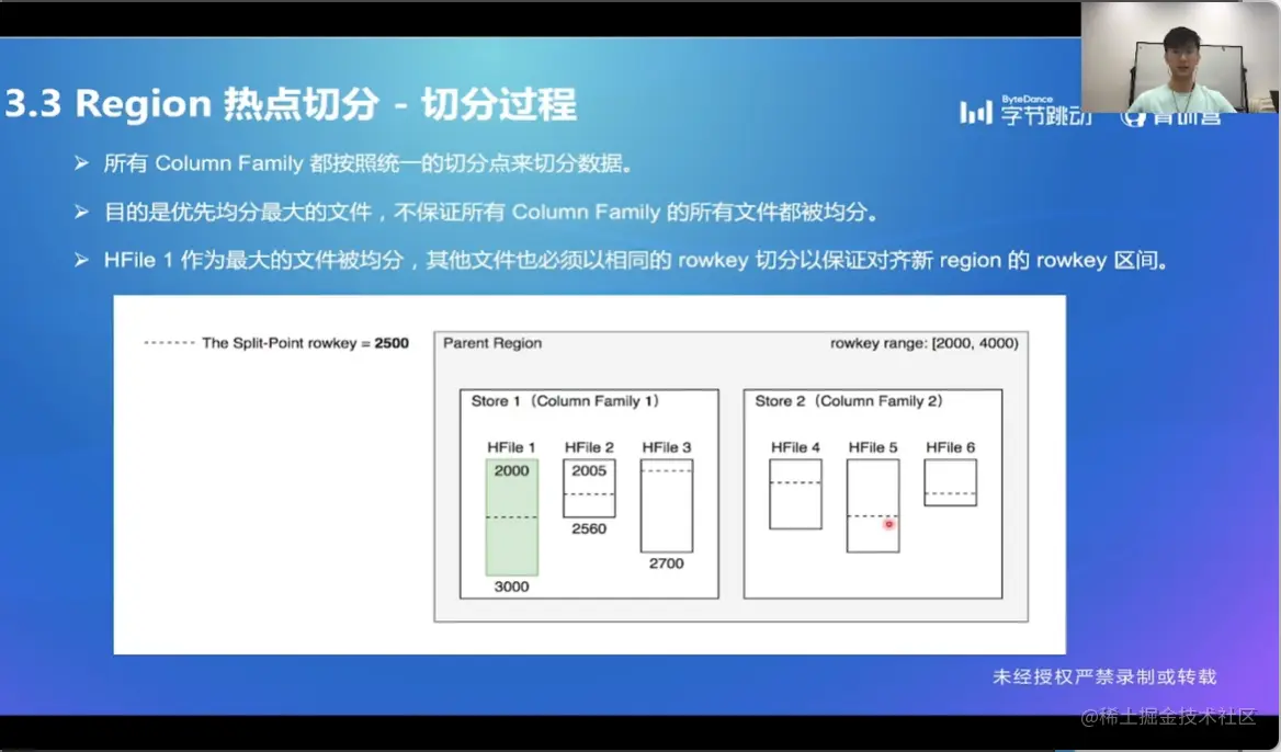 - 将整个Rowkey空间切分成很多段连续的分片,叫做region,交给RegionServer进行服务。