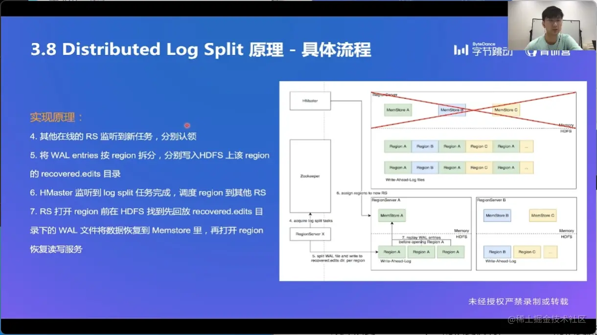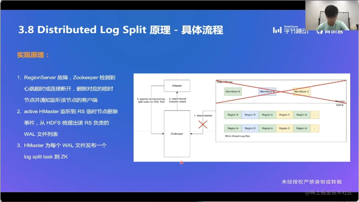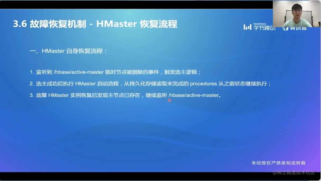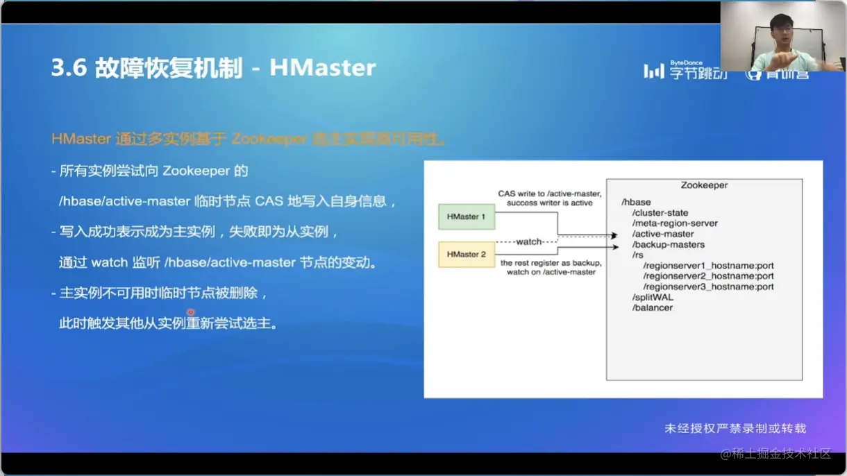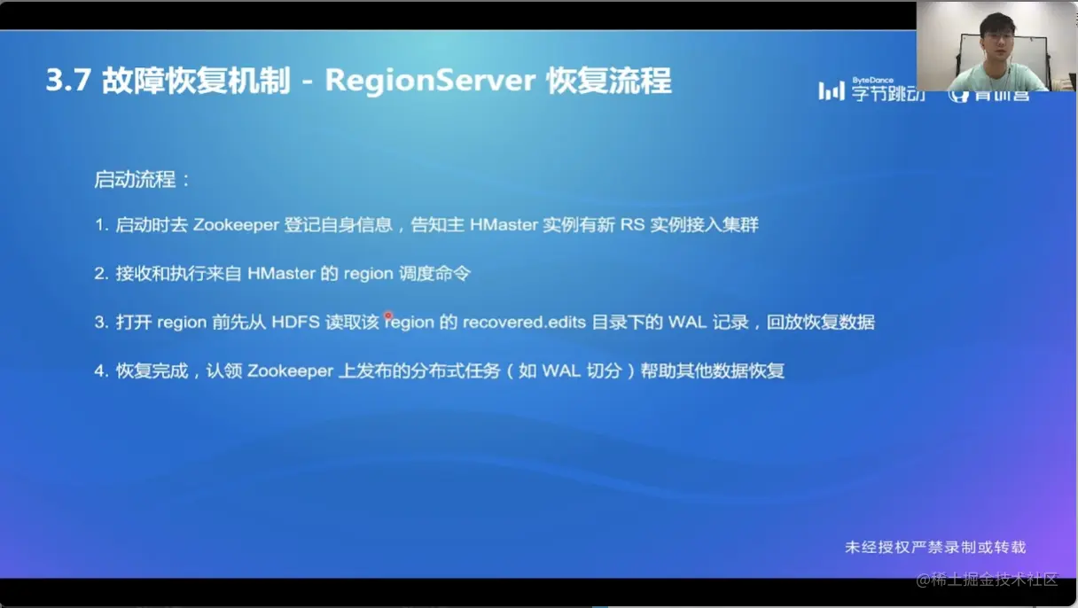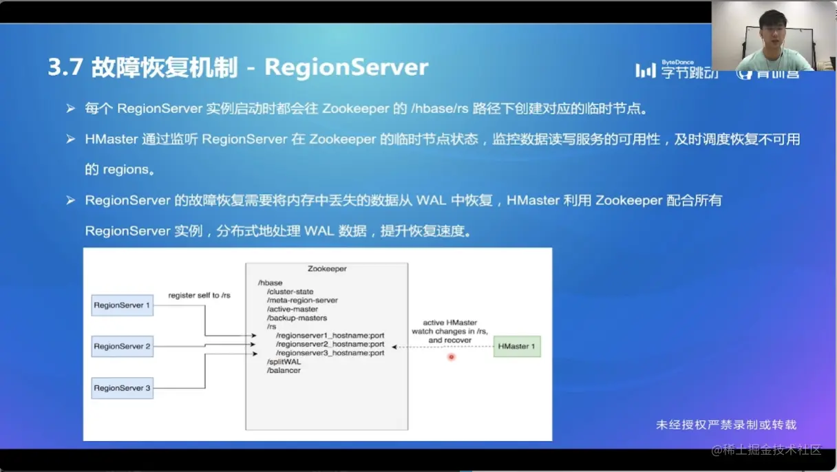 - 故障恢复:Zookeeper的恢复机制;HMaster的恢复流程,RegionServer的故障恢复流程