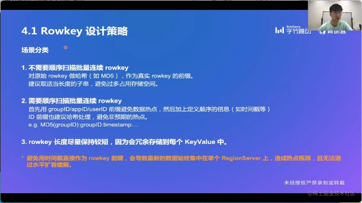 - Rowkey设计策略,HBase只支持Rowkey索引,所以这个很重要。