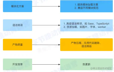 - 产物质量: 线上代码需要压缩、未使用的模块需要剔除