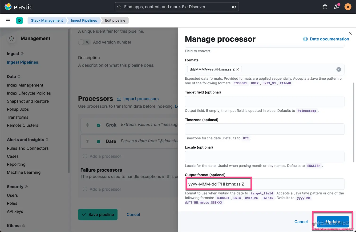 从上面的输出中,我们可以看出来显示的时间格式已经发生改变。它是按照我们默认的 locale 的时间格式来进行显示的。当然,我们甚至可以在 Date processor 里定义输出显示的时间格式,比如: