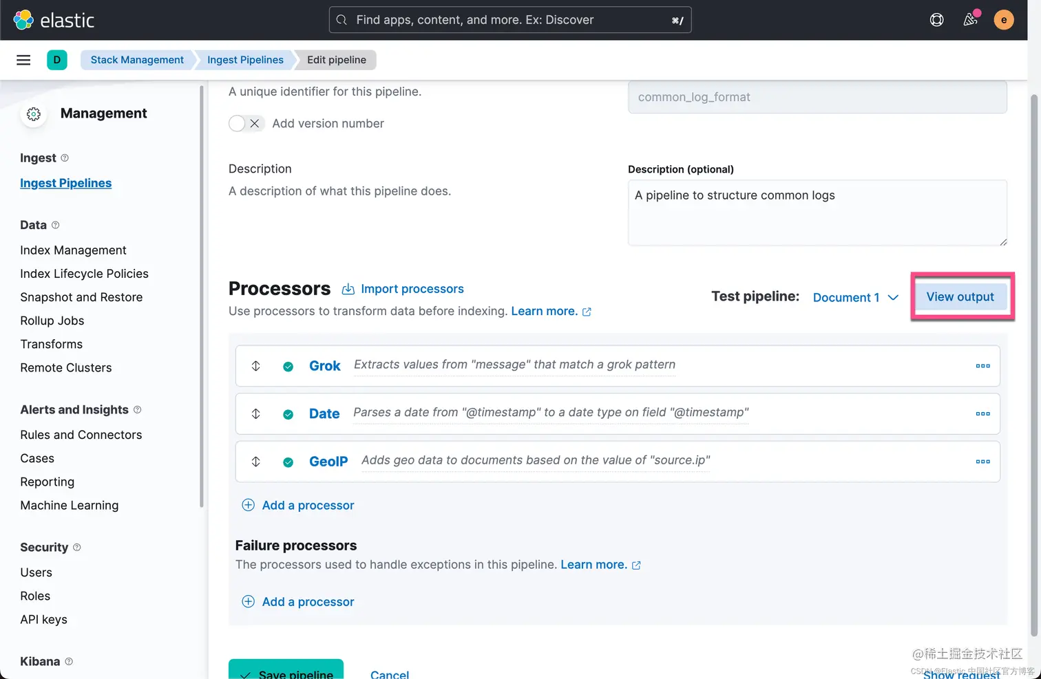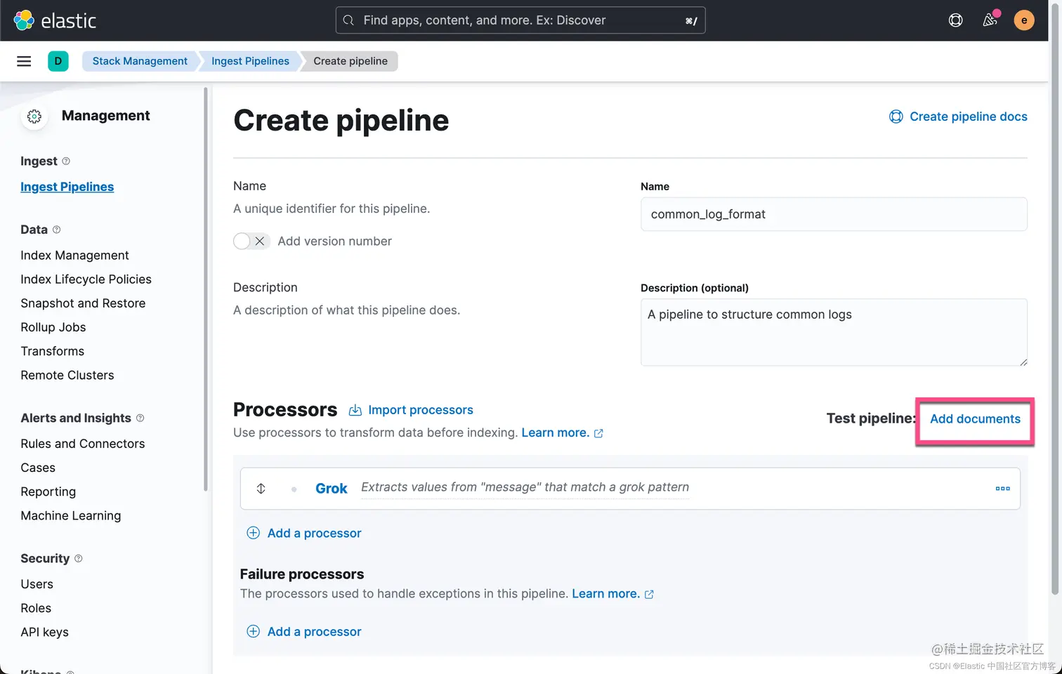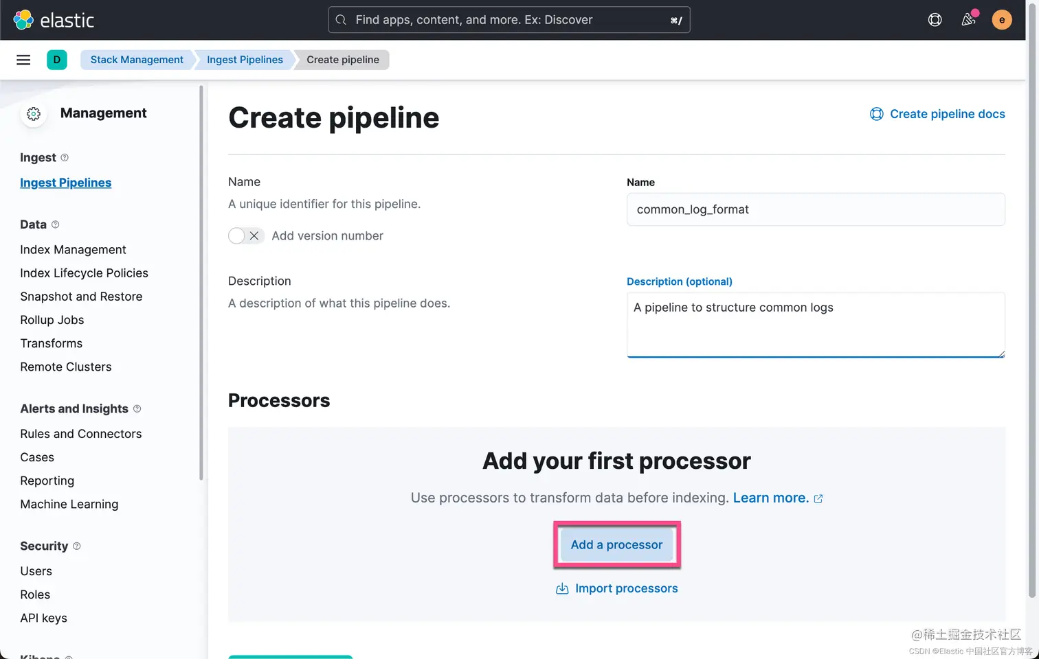 我们的 pipeline 名称定义为 common_log_format。接下来,我们来创建一系列的处理器来处理我们的日志: