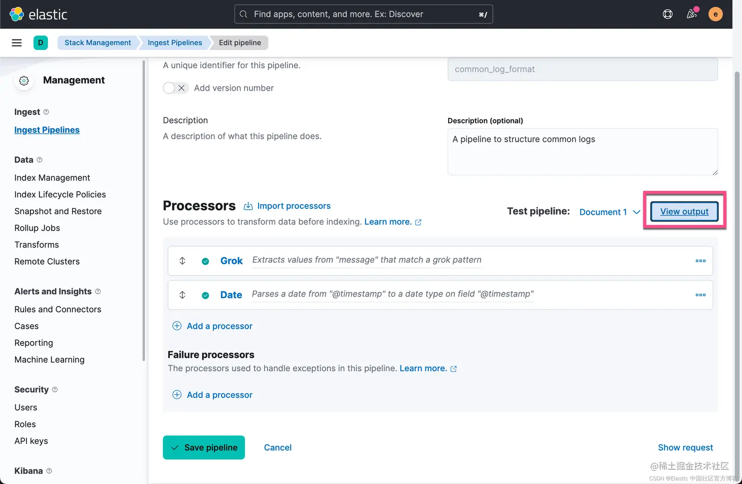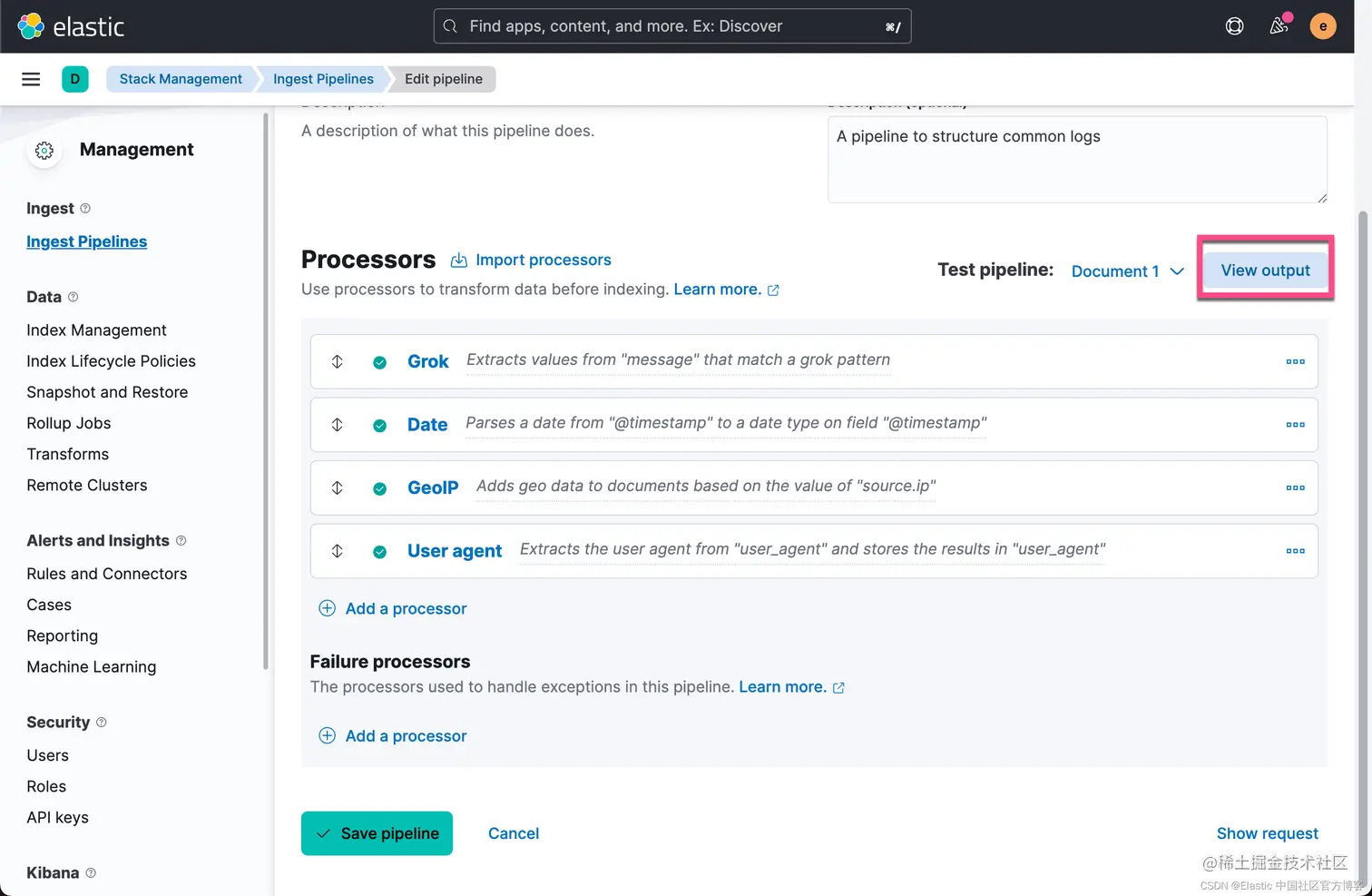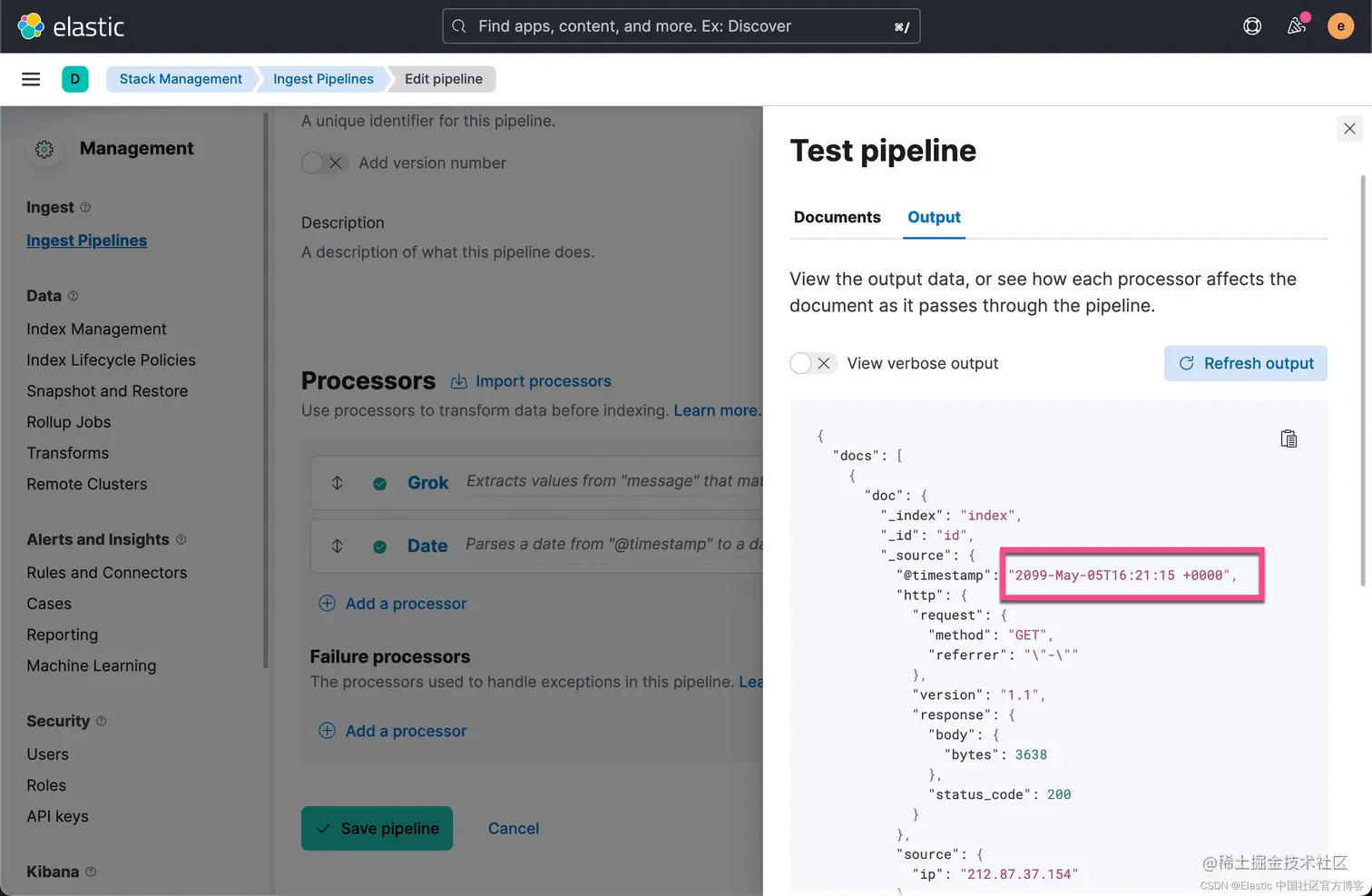 上面显示我们已经成功地创建了 Grok 及 Date processors。它们是按照顺序依次执行的。点击 View output 按钮: