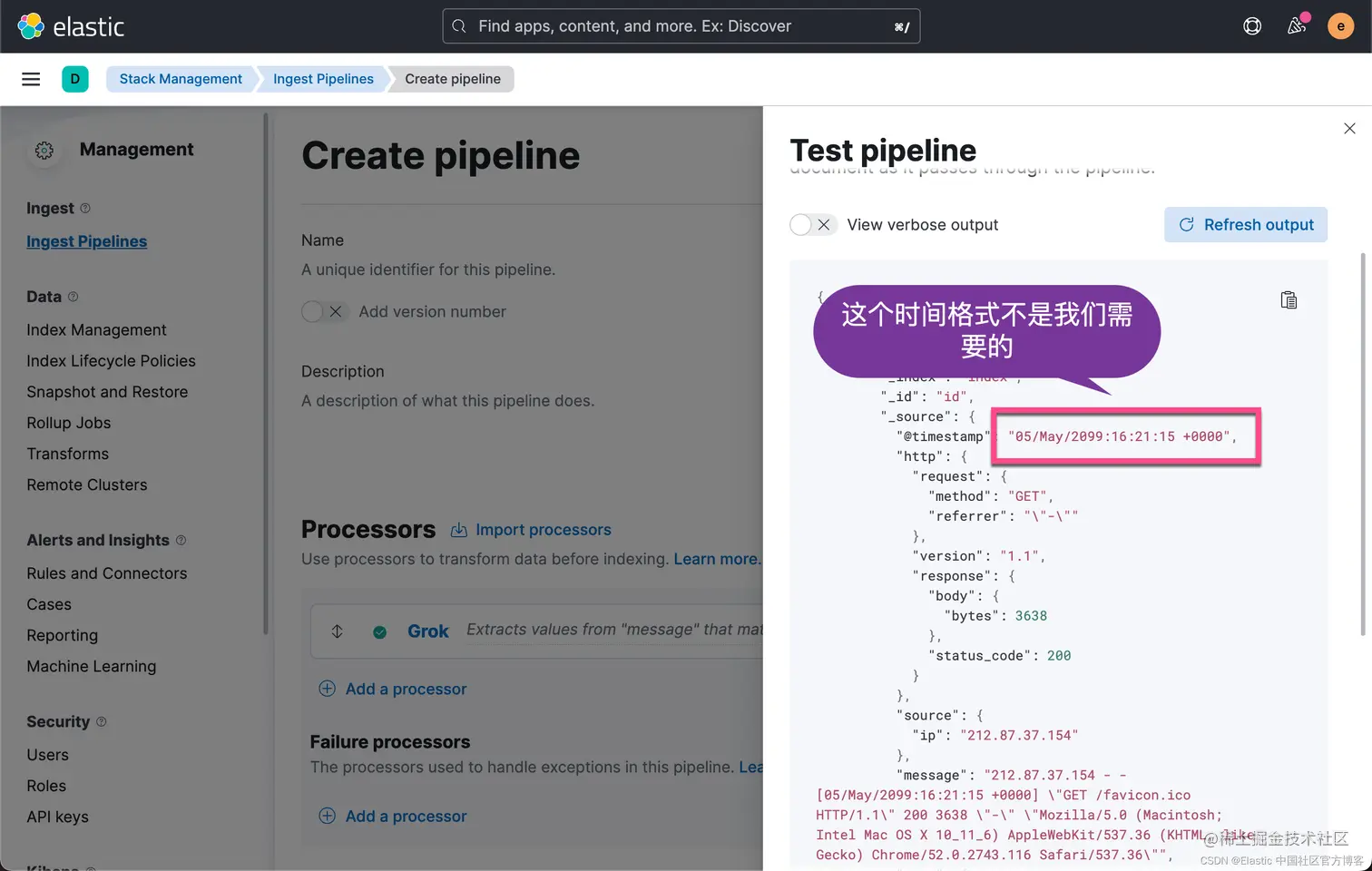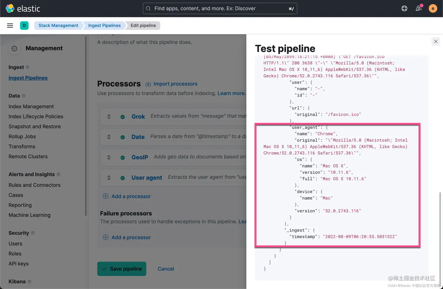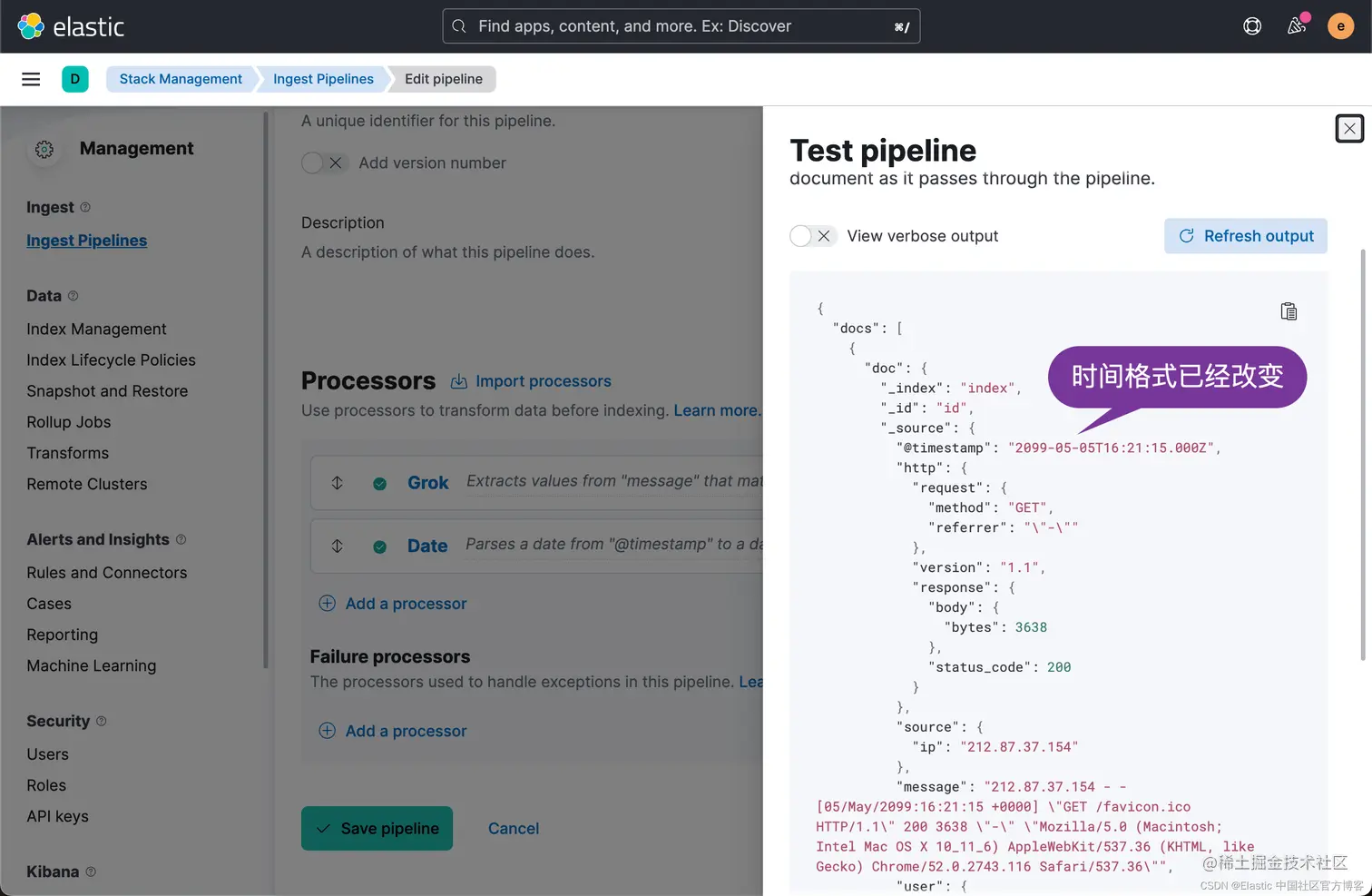 显然,我们的输出结果是正确的。然后,我们再使用上面的 ingest pipeline API 来创建一个 pipeline。