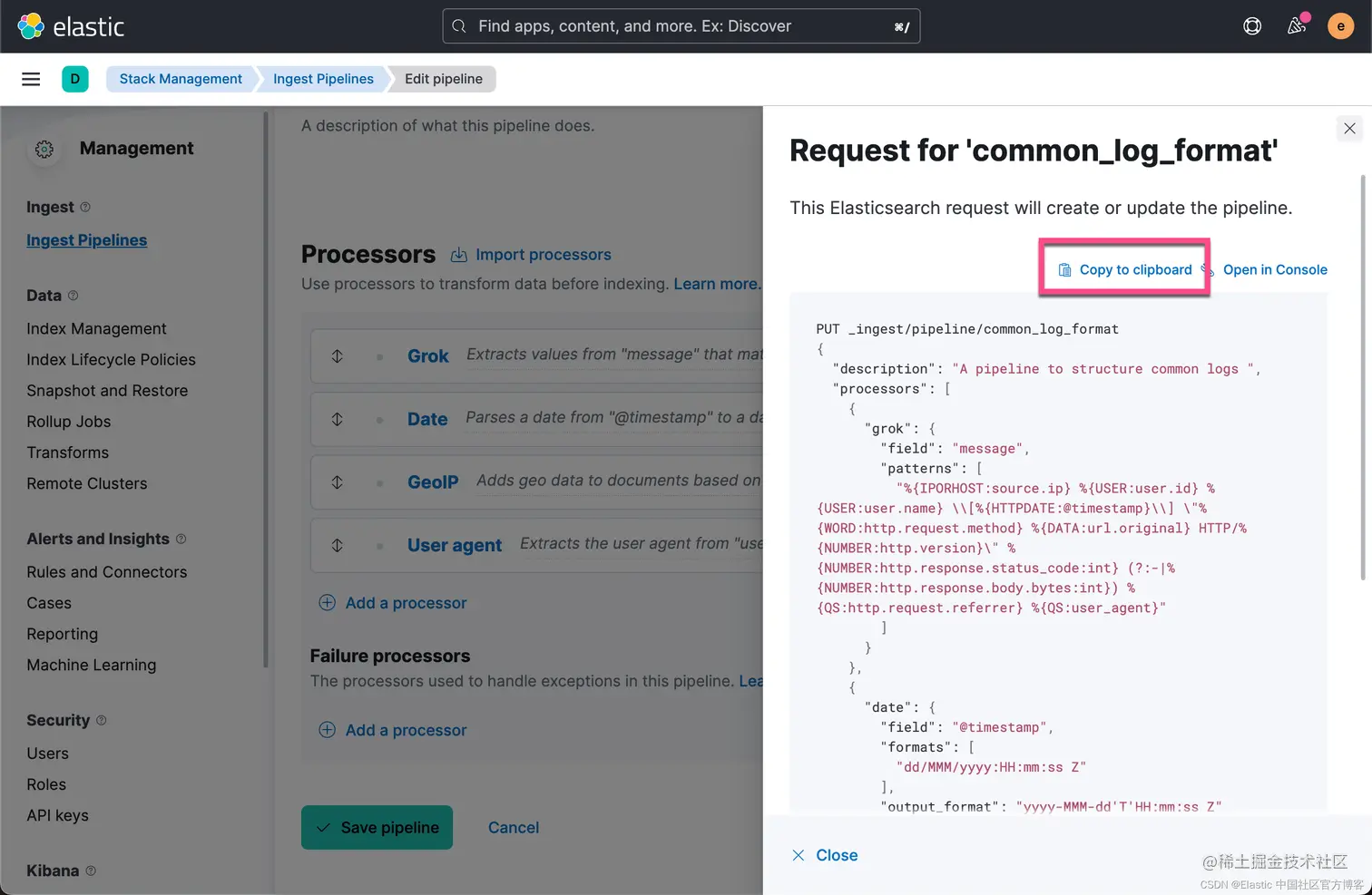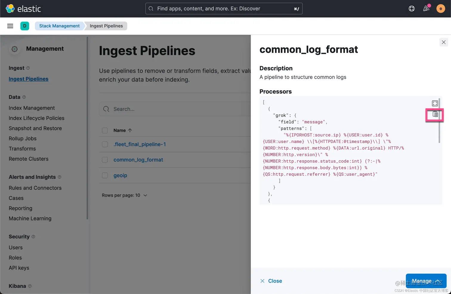 我们可以看到已经使用到的 processors。到目前为止,我们已经创建了一个叫做 common_log_format 的 ingest pipeline。 点击上面的拷贝按钮: