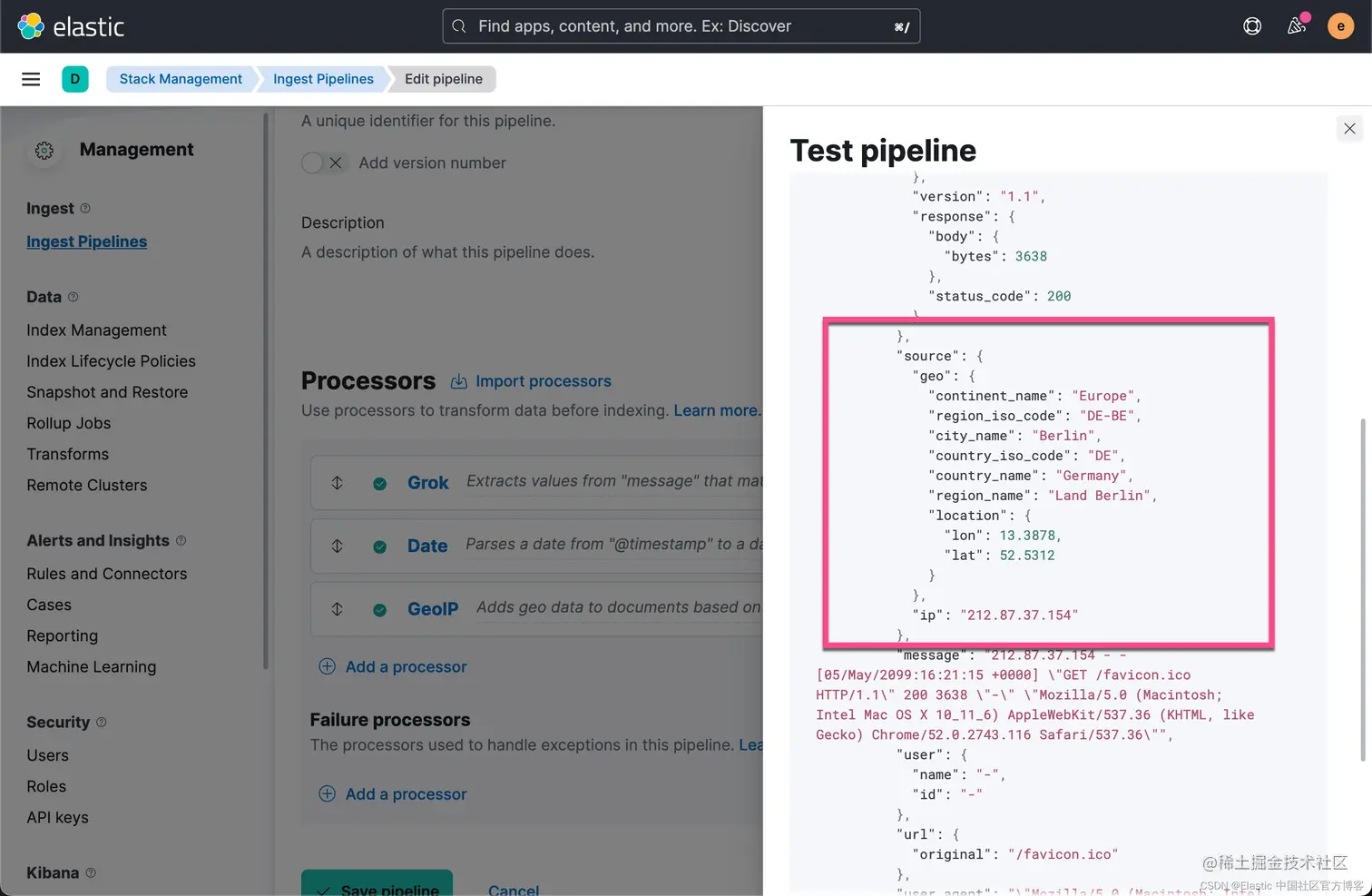 从上面,我们可以看到新增加的字段。 这样我们就添加了 GeoIP processor。