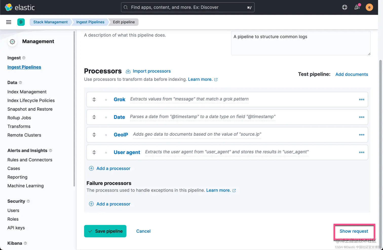 我们也可以使用 ingest pipeline API 来创建 ingest pipeline。事实上,我们在上面的步骤中也可以得到这个请求的格式: