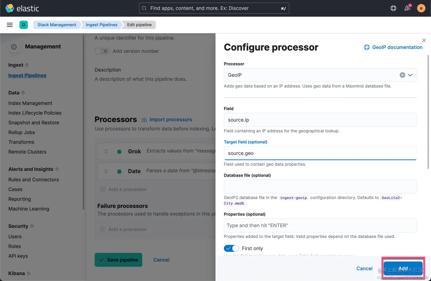我们可以使用 GeoIP processor 来找到发生请求的地方在哪里。 我们仿照上面的步骤,添加 geoip processor。我们针对 source.ip 字段来操作: