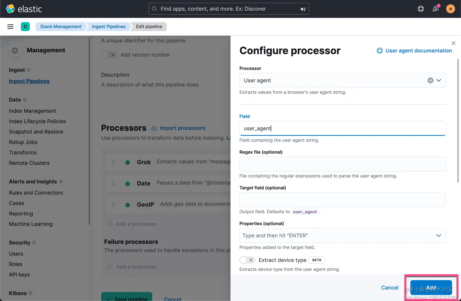 我们可以按照同样的套路来添加针对 User agent 这个部分的解析。我们使用 user agent processor: