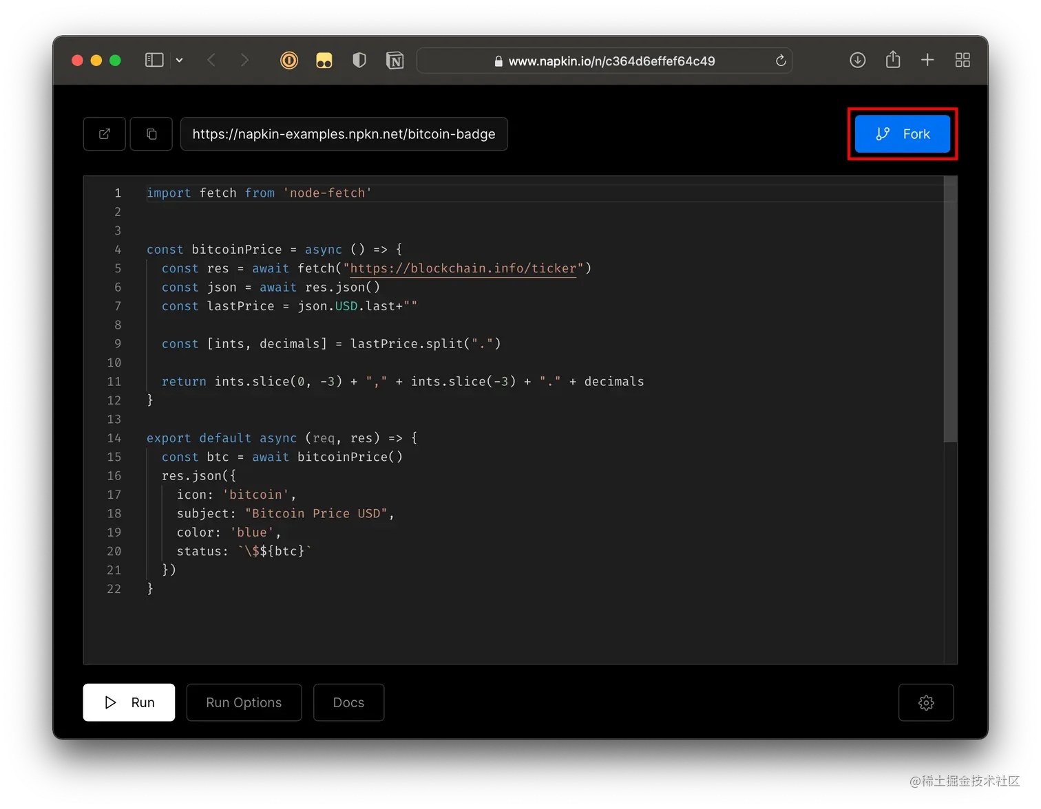 接下来,让我们分叉这个函数,这样我们就可以在其中加入我们自己的自定义代码。点击右上角的 "Fork "按钮即可。如果你还没有登录,你会被提示在Napkin上建立一个账户。