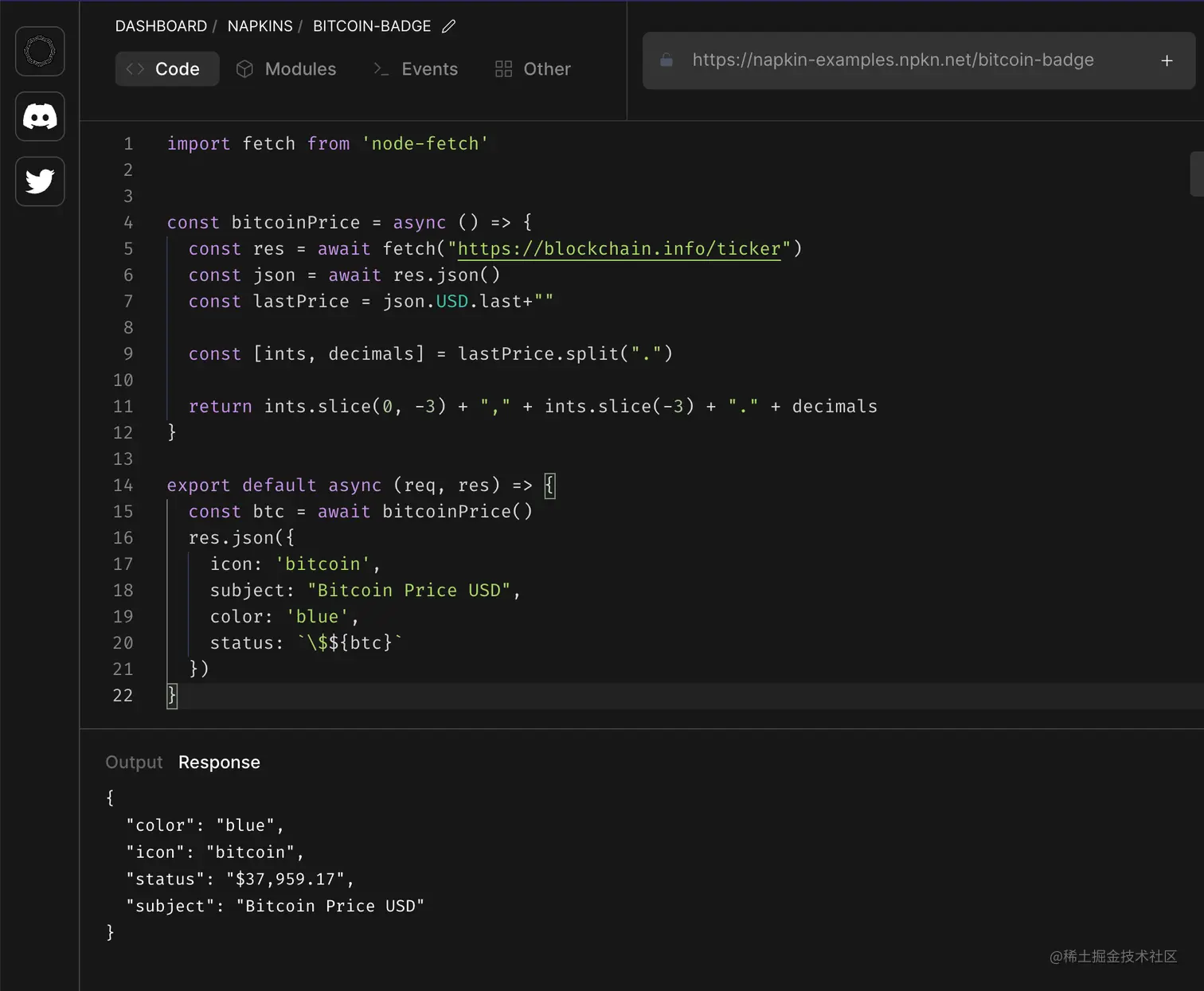 到Napkin的比特币徽章例子中去看一个端点例子。你可以在编辑器中看到检索当前比特币价格并以JSON格式返回的代码。你可以自己从编辑器中运行代码,或者直接使用端点。