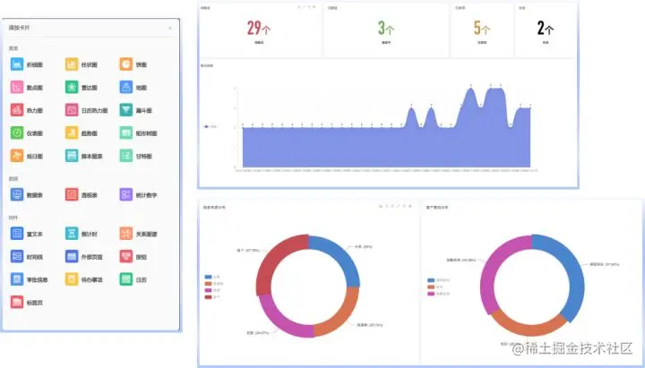 28种卡片仪表盘,根据数据源可自定义各类数据分析仪表盘。